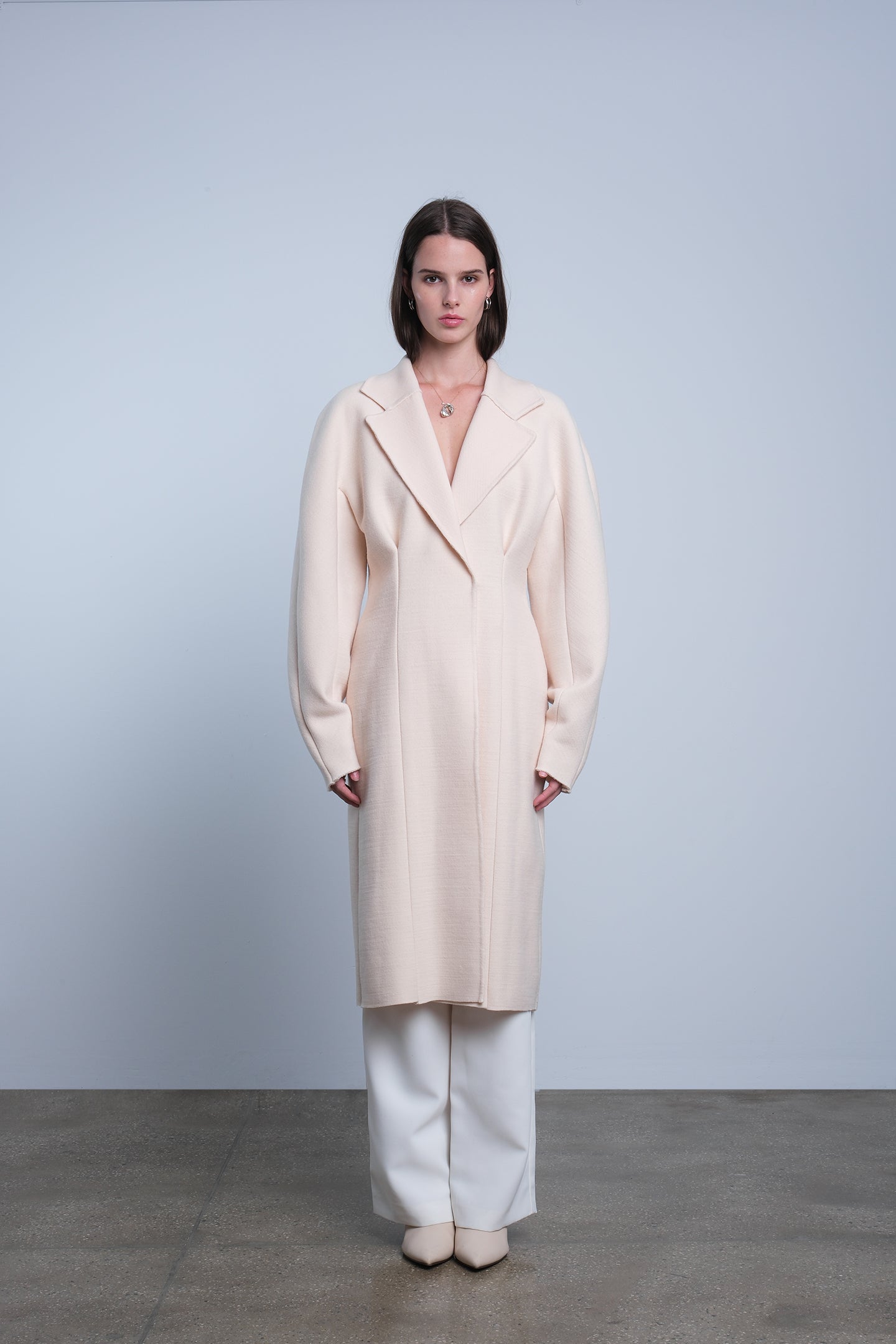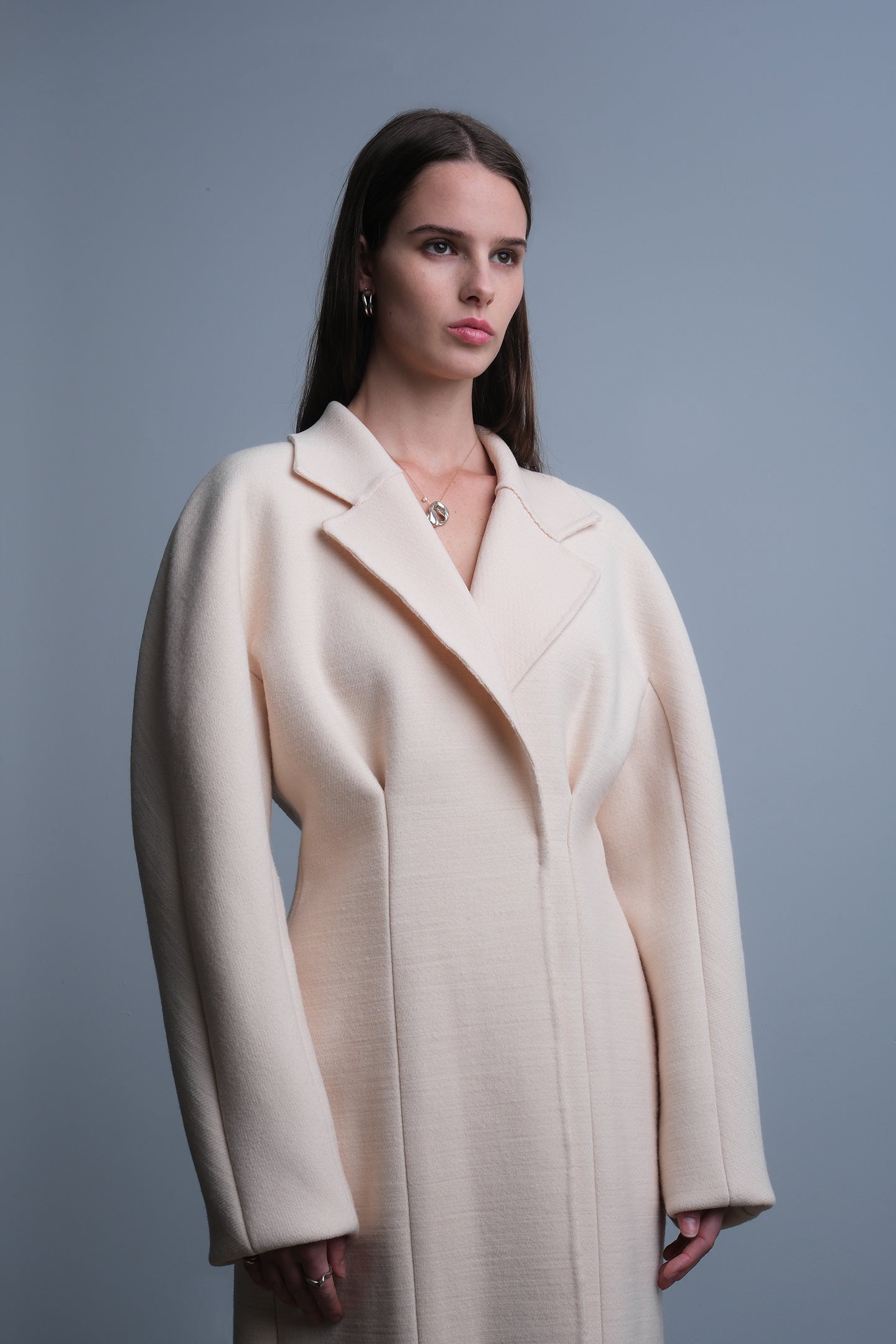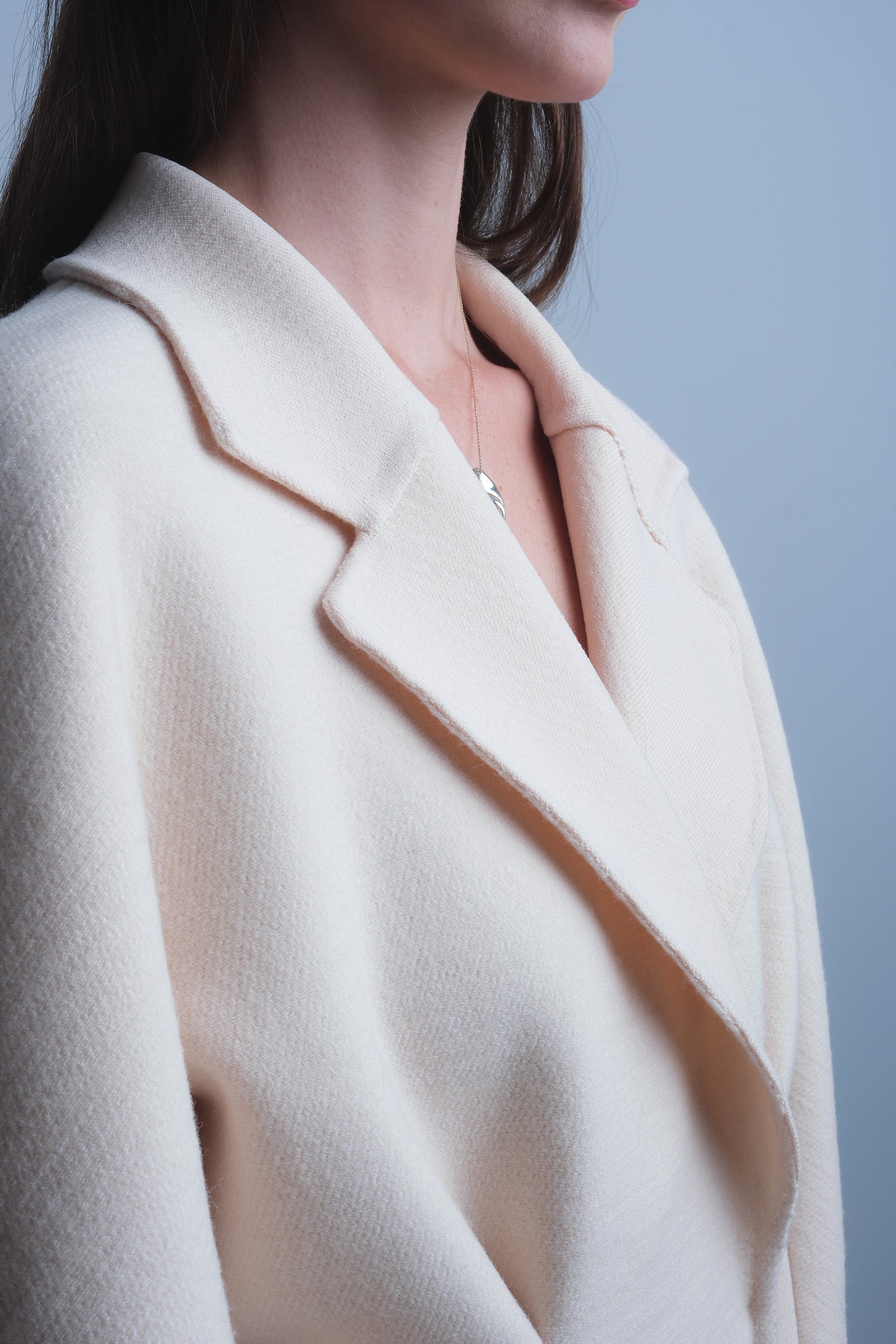 Hand made, double-faced virgin wool, the Lydia Coat embodies sculpted refinement and luxury. The silhouette features precise pleats that define the waist and fall in a clean, continuous line to the hem, creating a sense of structured ease. Finished along the edges by hand, it reflects a subtle dedication to craftsmanship. Perfect for layering over knits, dresses, or tailored separates, it moves effortlessly from day to evening, offering warmth and elegance for the fall and winter season.