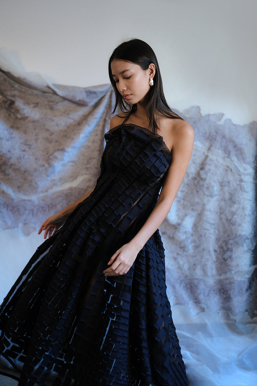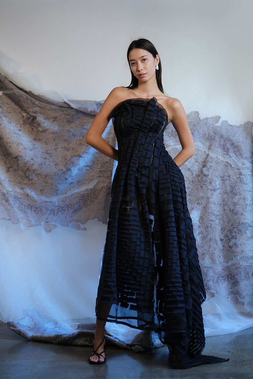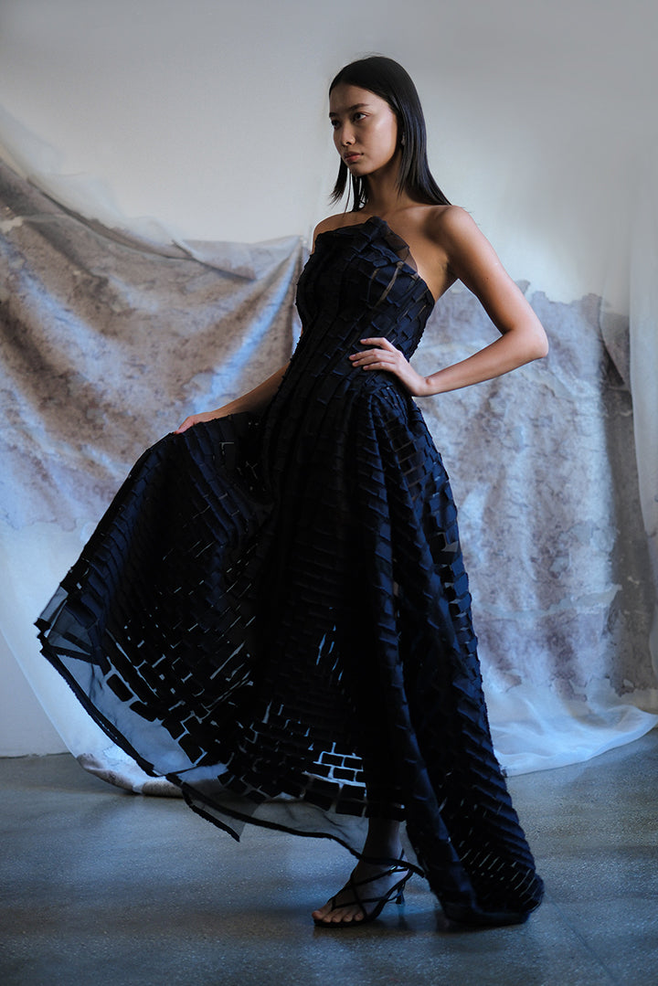 This strapless gown is a study in sculptural elegance. Expertly hand-draped and sewn, it flatters the figure with a fluid yet structured silhouette, creating movement that is both dramatic and effortless. The custom fil coupé fabric, developed exclusively for this piece, features a subtle textured pattern inspired by geometric precision, adding depth and dimension to the design. Every fold and seam is carefully placed, making this gown a striking statement from every angle.