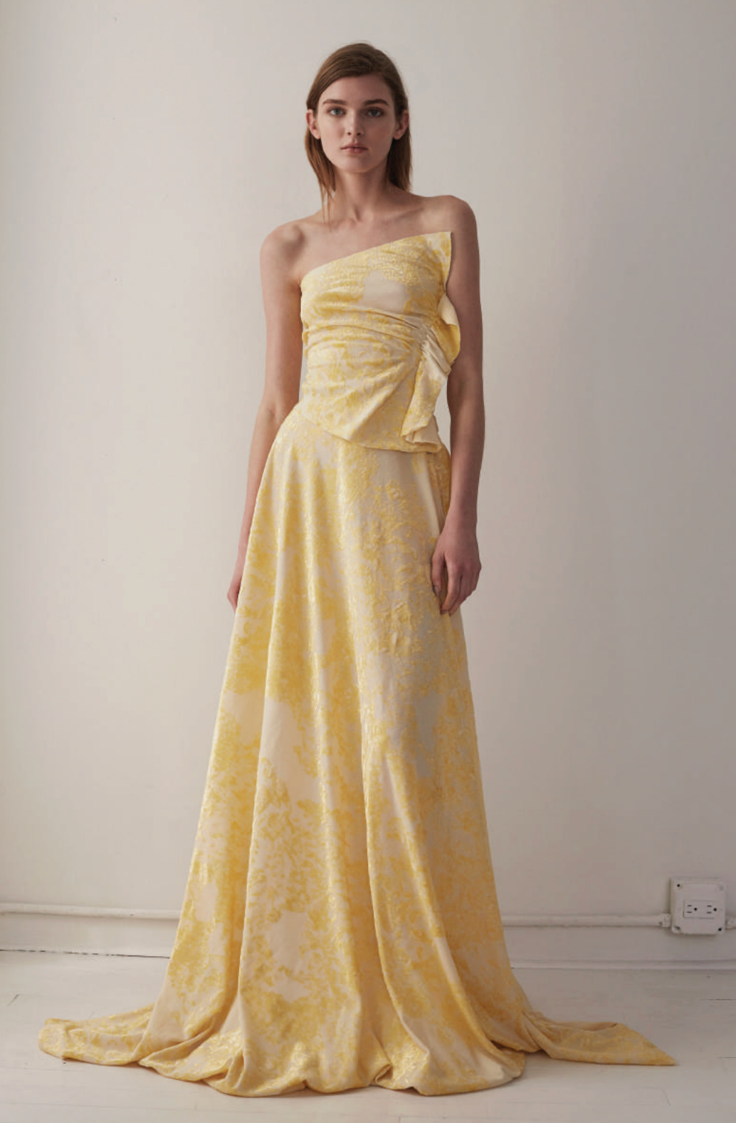 The Cliora gown is a stunning option for a special occasion. Cut from a flowing jacquard with a beautiful gilded pattern, the bodice features delicate ruching.