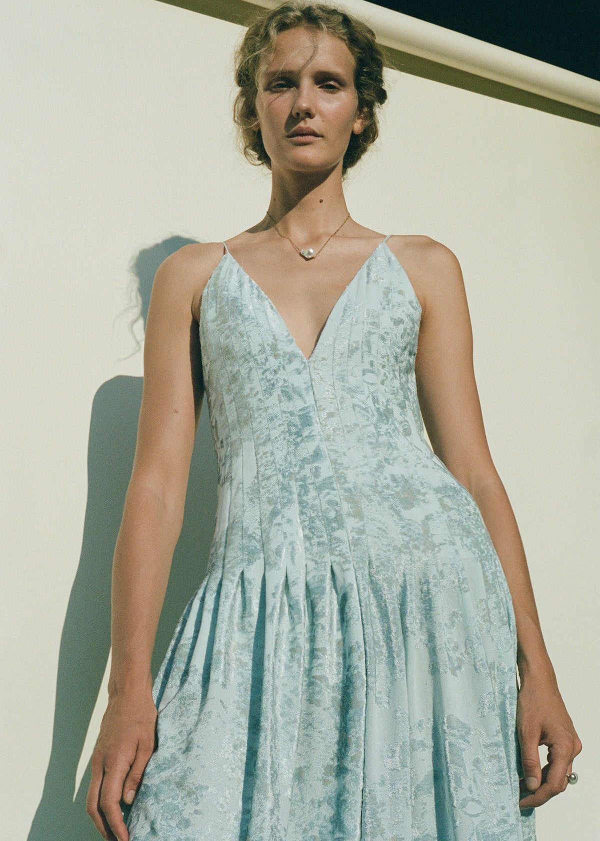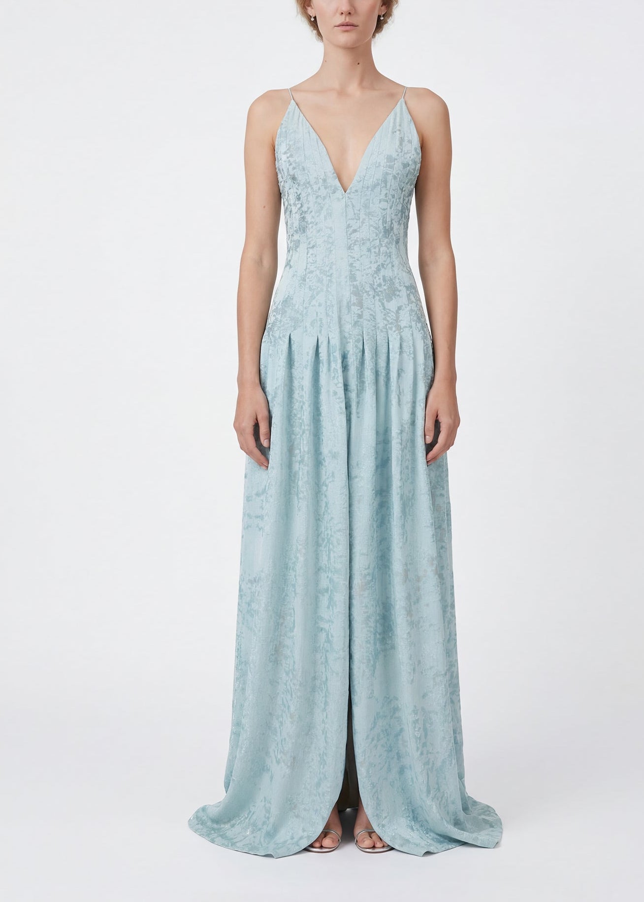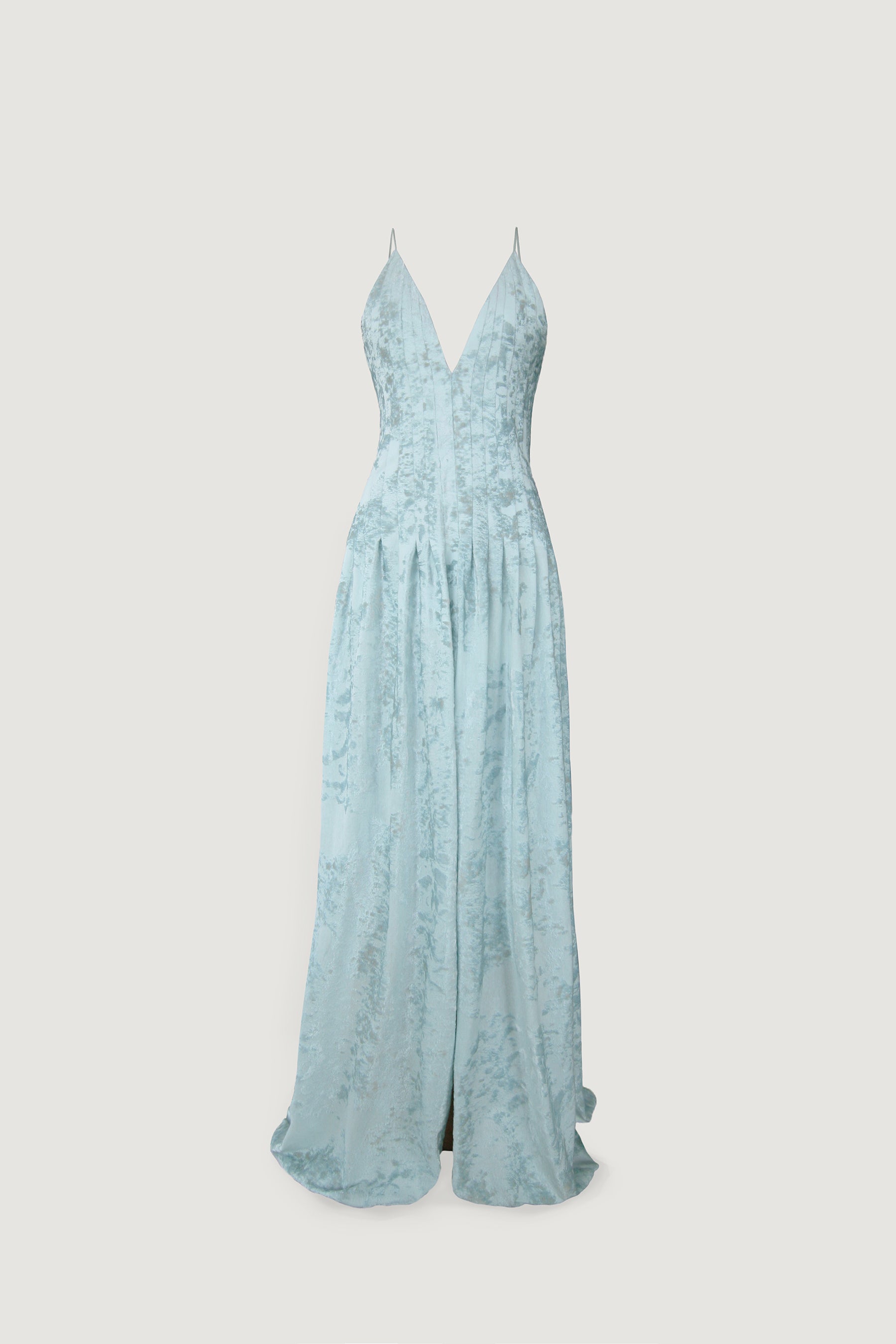 This Eliana gown is crafted at the hands of skilled artisans. It is made from exclusively developed jacquard fabric designed to emulate the sea reflections from a historical town in Greece. Beautiful hand draped pleats around the chest and waist fit elegantly with a draped maxi skirt.