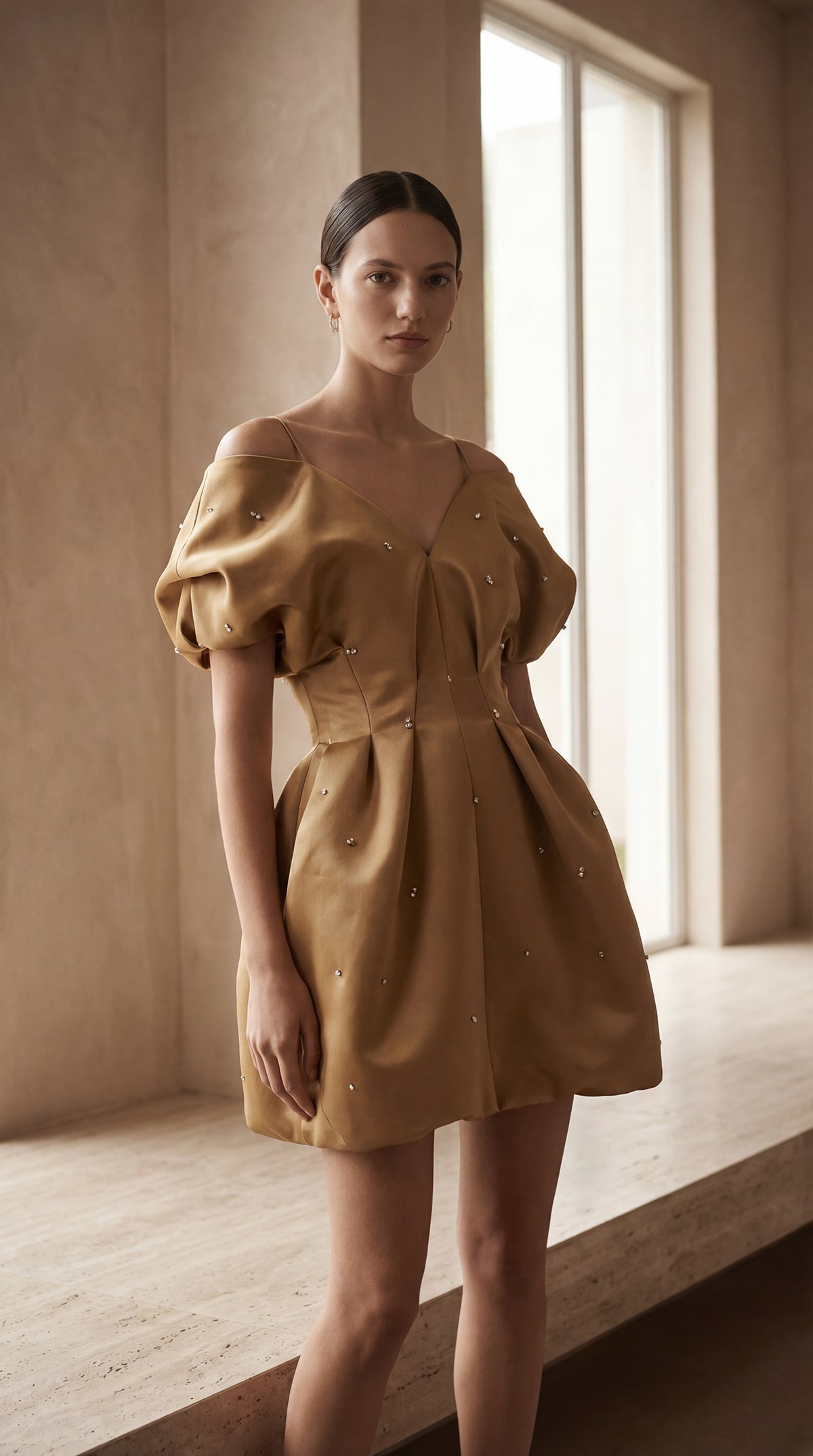 실크와 울 혼방 소재로 제작된 드레스입니다. 주름진 허리선과 깊은 V넥이 특징입니다.