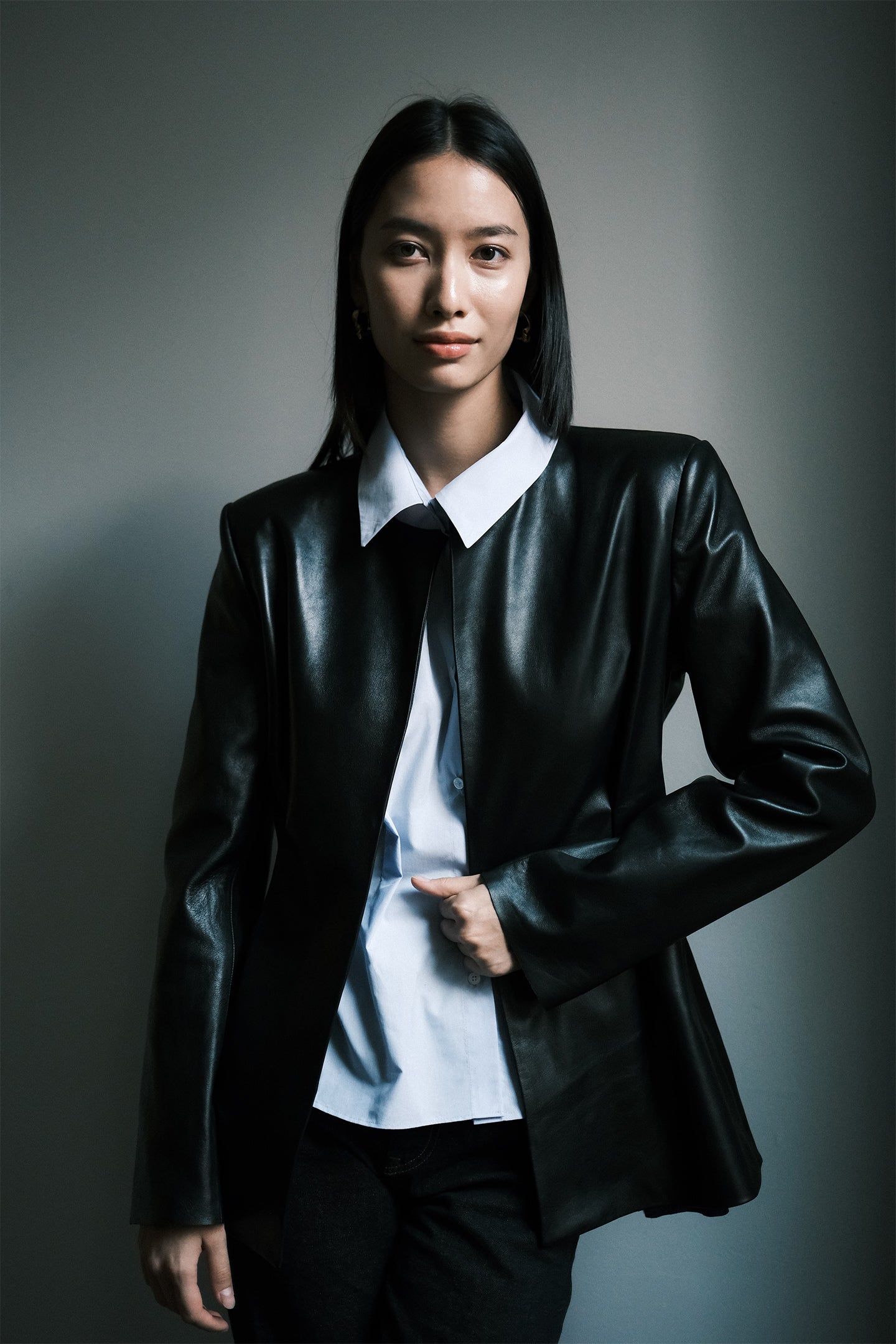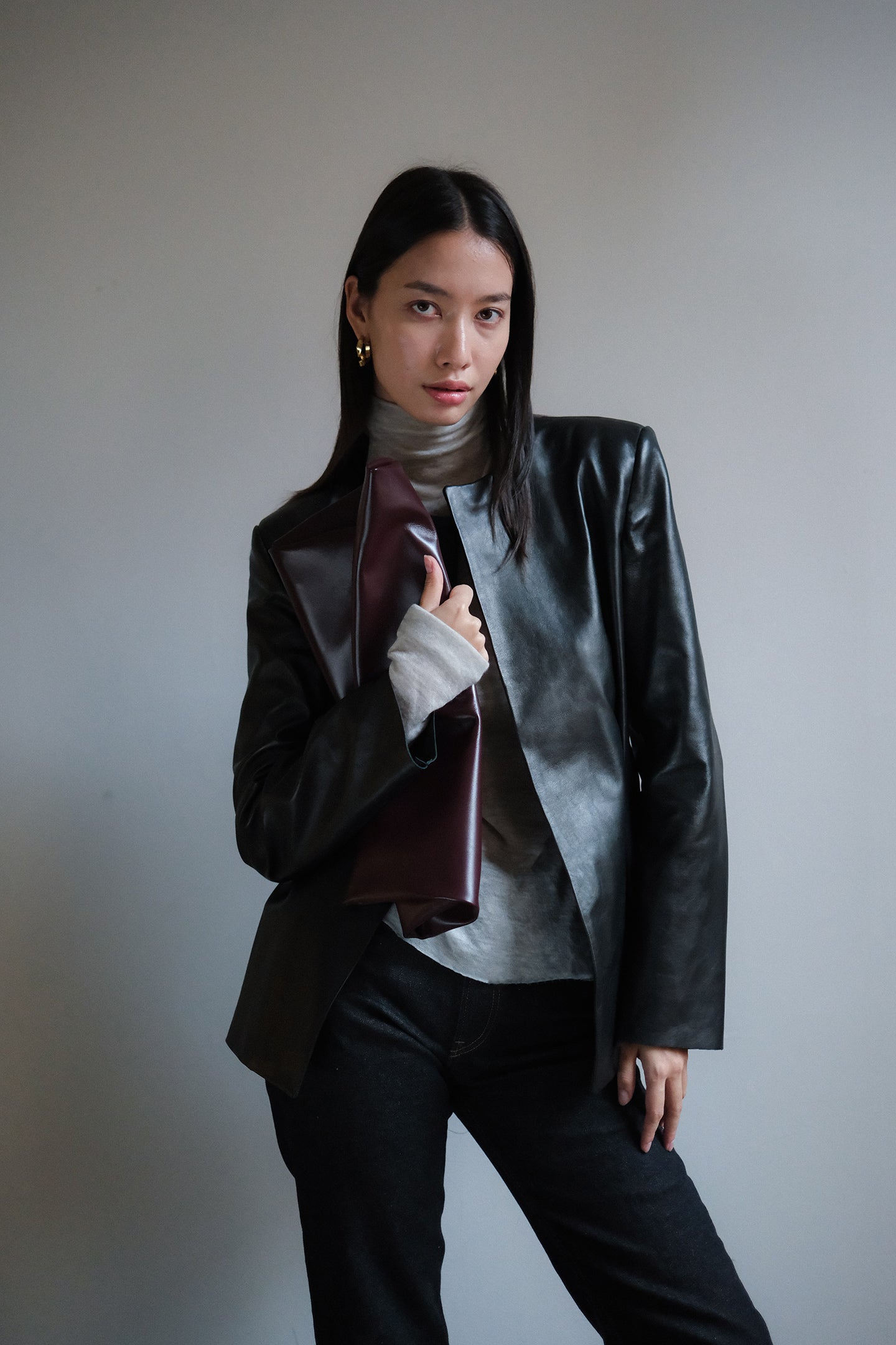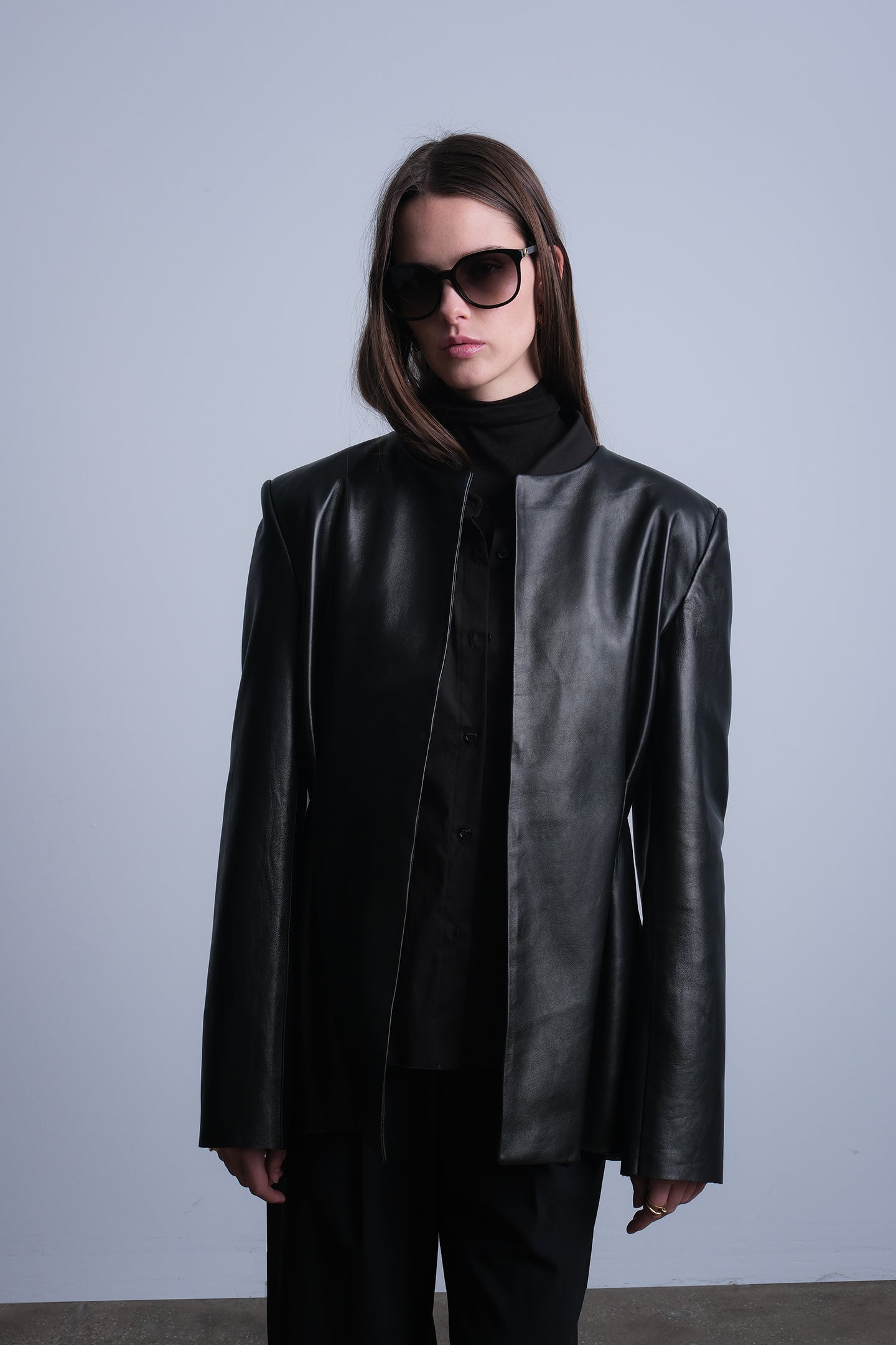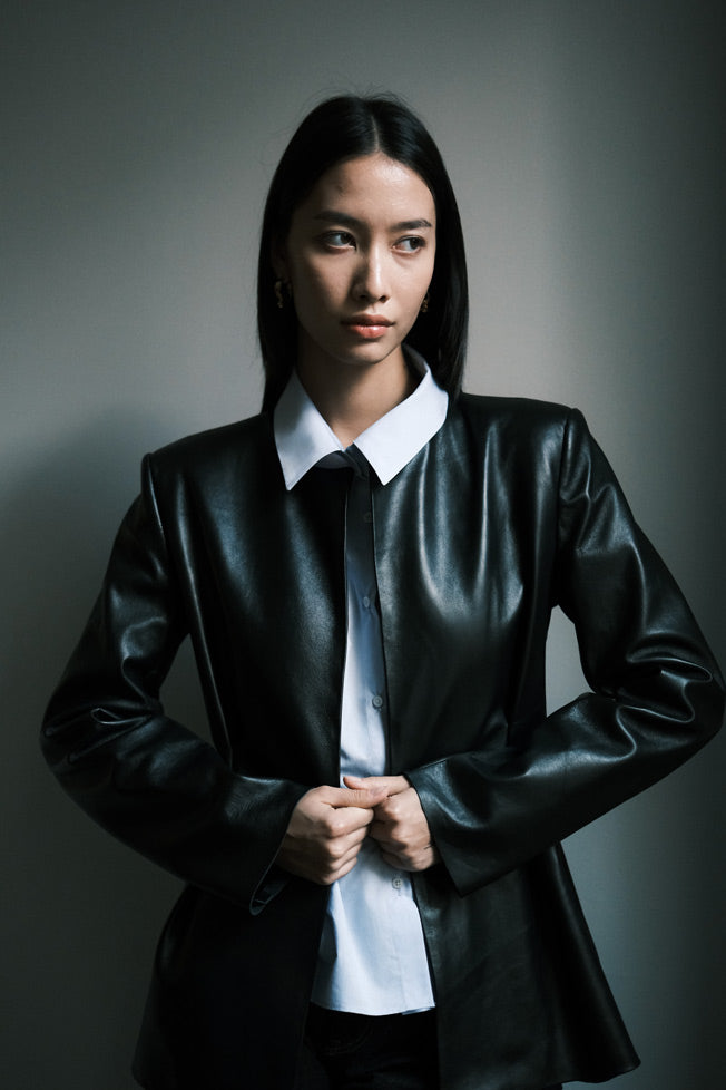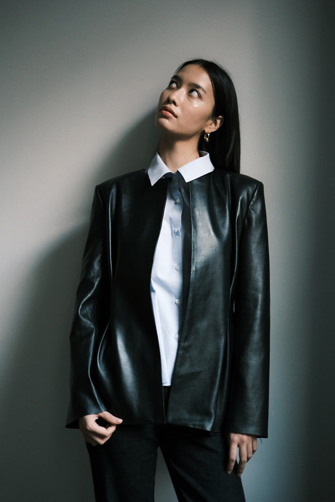 The Esme Blazer is a study in understated structure. Crafted from supple lambskin leather, it features a clean, collarless neckline and soft pleat detailing at the front — a quiet twist on classic tailoring. The silhouette is refined yet effortless, designed to drape naturally with the body while maintaining a sculptural edge. A timeless wardrobe piece that transitions seamlessly from day to night, it embodies modern sophistication with a subtle sense of strength.