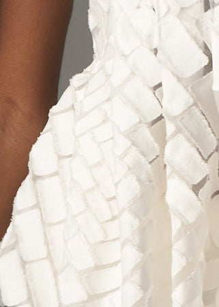 This strapless gown is a study in sculptural elegance. Expertly hand-draped and sewn, it flatters the figure with a fluid yet structured silhouette, creating movement that is both dramatic and effortless. The custom fil coupé fabric, developed exclusively for this piece, features a subtle textured pattern inspired by geometric precision, adding depth and dimension to the design. Every fold and seam is carefully placed, making this gown a striking statement from every angle.